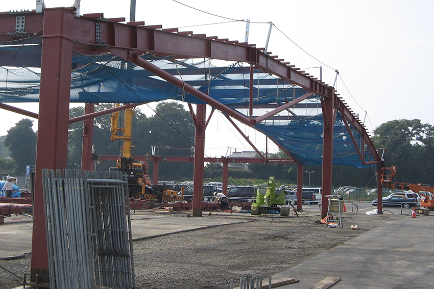 天候に左右されず競走馬の調教ができるように、既存の坂路に上屋を設けた無壁建物。この用途の建築では、ラチス梁を採用することが通常ですが、スラントバー工法を採用することで小断面のH型梁を使用しコスト削減ができました。また、屋根・下り壁はテント材料を使用することで更に軽量化できました。